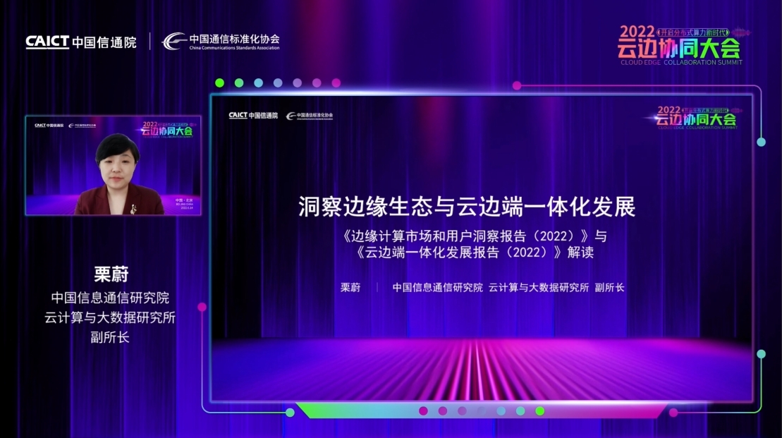 作为本届大会的一大亮点,中国信通院首发《边缘计算市场和用户洞察报告(2022)》《云边端一体化发展报告(2022)》和《边缘计算产业全景图(2022)》,中国信通院云大所副所长栗蔚对两份报告和全景图进行了解读。