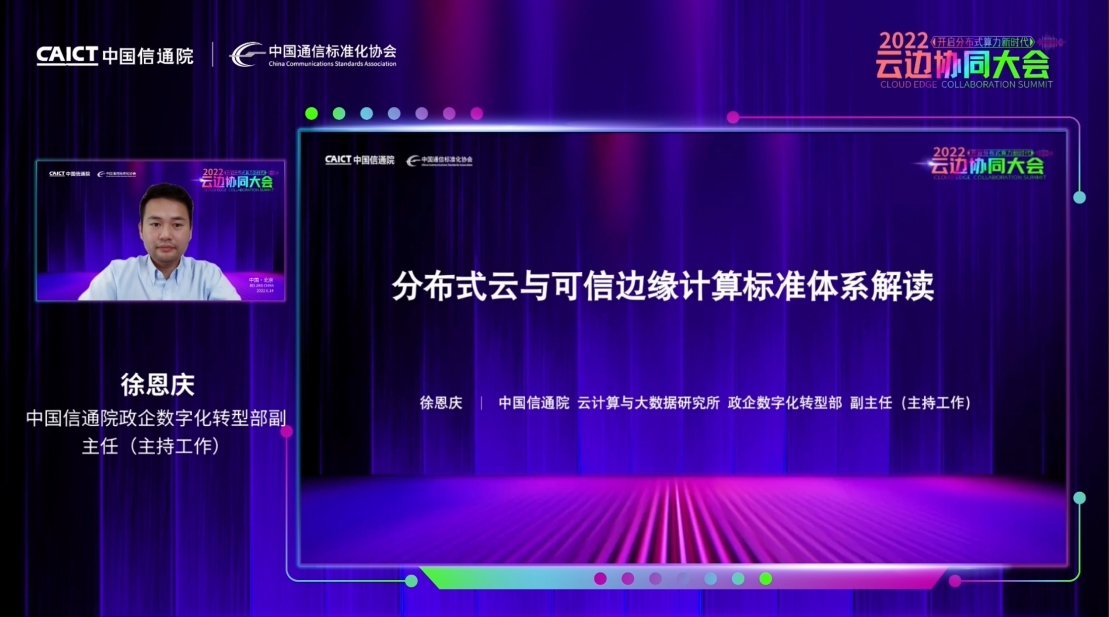 中国信通院云计算与大数据研究所政企数字化转型部副主任(主持工作)徐恩庆发表《分布式云与可信边缘计算标准体系解读》演讲