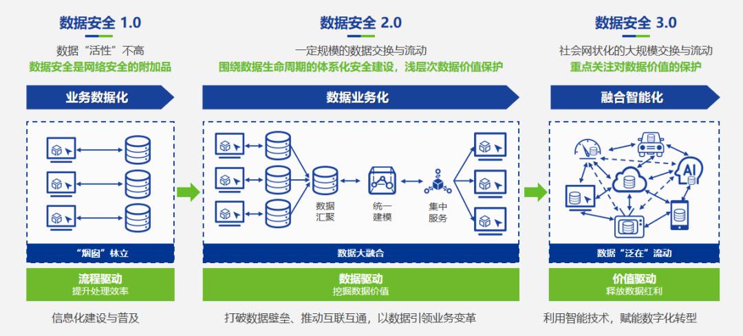 随着IT基础架构和法律法规的变化,数据安全已经从“孤岛式系统建设的1.0时代”到“数据集成与汇聚共享的2.0时代”,现在正步入“聚焦对数据价值全面保护的3.0时代”。