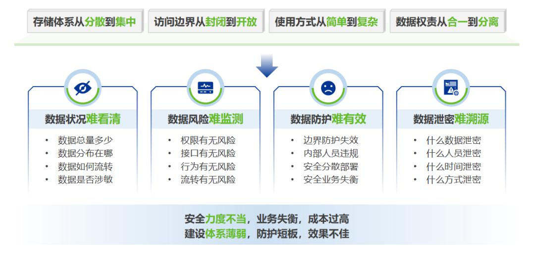 伴随着数据资产逐渐集中、访问边界更加开放、使用方式越发复杂、数据权责已经分离的现状,数据的本质发生了巨大的变化。我们越来越难以清楚地看到所拥有数据的整体状况和各个环节面临的风险,加上体系化数据安全建设和泄密溯源能力的缺失,数字化转型工作面临安全力度不当、安全业务失衡、安全成本过高等巨大的挑战。