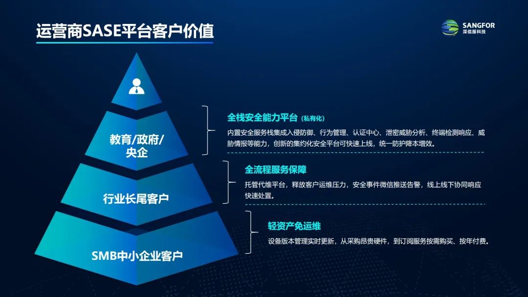 SASE 3.0通过平台方式把安全工具化、服务化,从而能够让运营商为广大用户提供初步的安全服务能力,同时我们将开放SASE 3.0能力对接深信服MSS、XDR平台以及广大安全生态伙伴、以便用户给提供更高阶的和一站式安全服务。