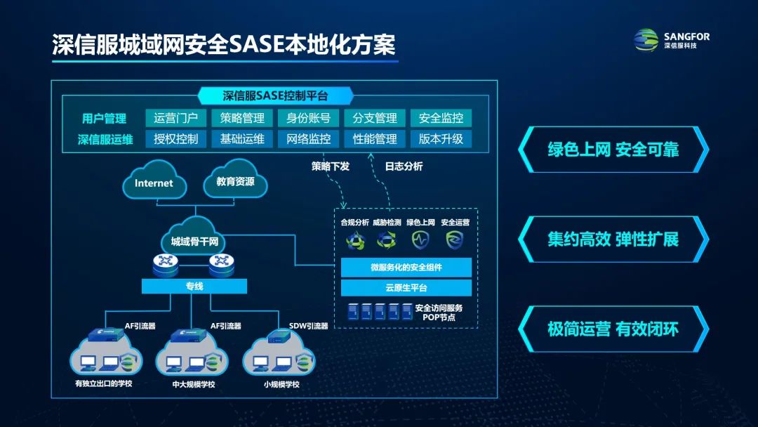 深信服SASE 3.0采用高密度的方式实现安全组件微服务化、容器化,中小学只需通过门户订阅服务,教育局通过集约化的方式即可实现集中运维,打造良好上网环境,按需部署安全能力,实现极简运维。
