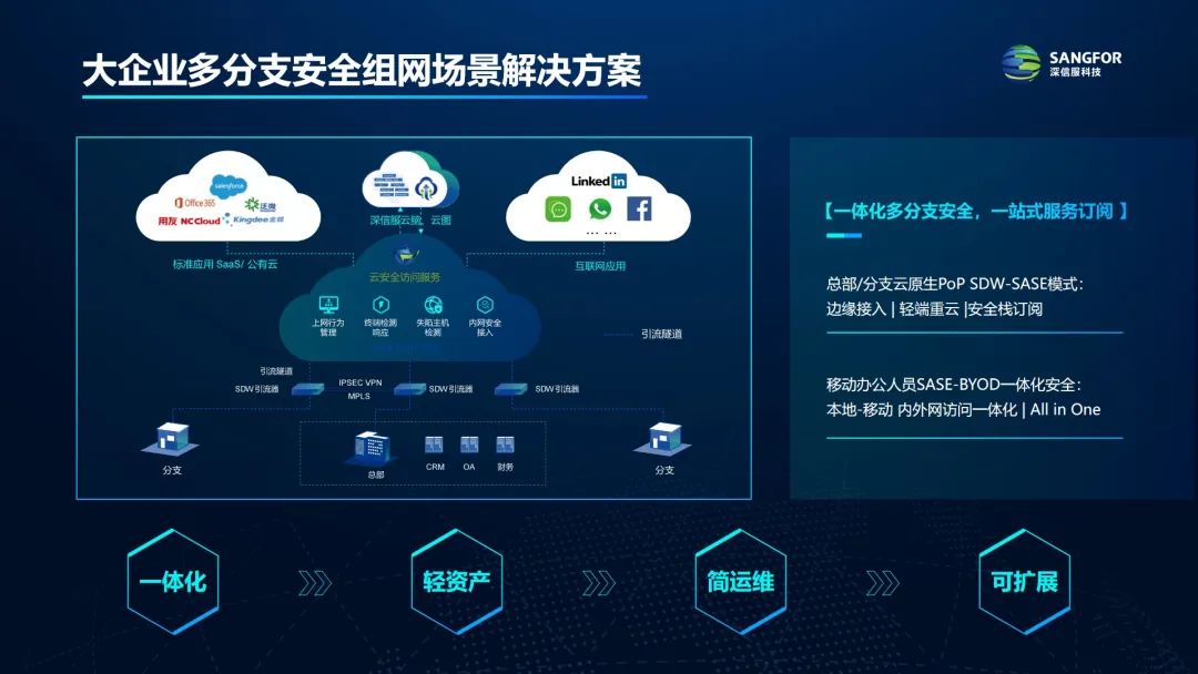 因此,除了轻资产的方案外,我们让深信服所有的安全设备都能接入SASE。对用户来说,使用SASE,不是把现有设备都换掉的是非题,而是基于当前保有设备实际使用,按真实场景选择最优方案的多选题。