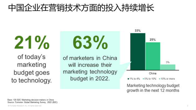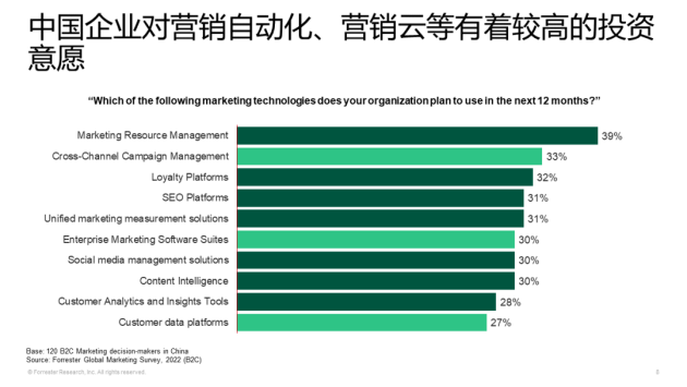 近日,Forrester 采访了中国的120位的营销决策人员,询问他们在未来的12个月内愿意投资哪项营销技术,结果表明,投资意愿最高的是Marketing Resource Management(营销资源管理),达到了39%。其次是CCCM(营销自动化),有33%的企业愿意投资在这个领域。还有如客户忠诚管理、营销云、CDP 等等排在较高的位置。