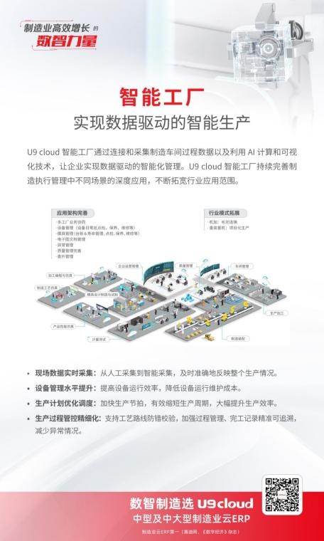 比如智能工厂场景中,U9 cloud通过连接和采集制造车间过程的相应数据,通过AI和可视化的技术,能够让企业实现数据驱动的智能化管控。同时,U9 cloud的智能工厂也一直在持续的完善车间计划、生产调度、生产物流、异常反馈、质量管理以及设备管理等不同场景的一些深度应用。