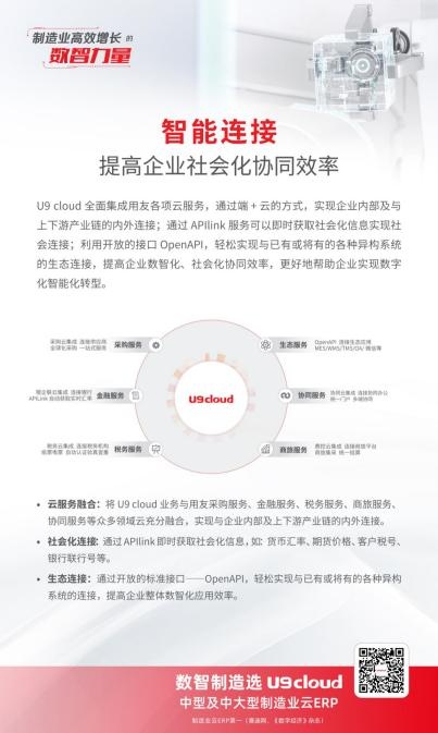此外,U9 cloud还特别强调了智能连接的能力,帮助企业连接采购服务、金融服务、税务服务、费控服务、协同服务等云应用,实现跨组织、跨部门、跨地域的协同。而疫情当下,整个供应链的连接和效率已成为重中之重。