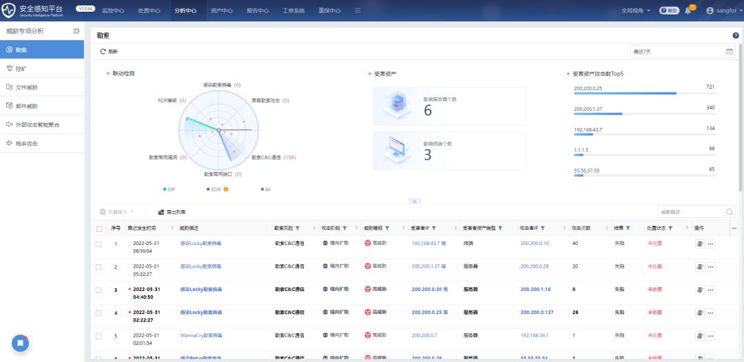 医院部署的深信服安全感知管理平台SIP,通过勒索专项分析定位到某主机在最近的1分钟内,多次对外请求恶意域名,疑似WannaCry勒索病毒家族,且存在进一步恶化的风险。