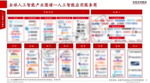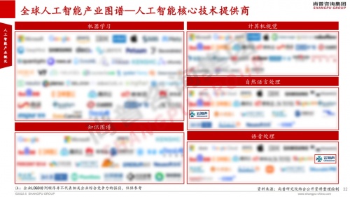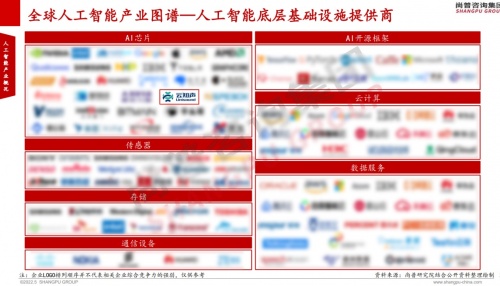 本报告中,尚普研究院从全球视角出发,将全球人工智能产业链主要分为人工智能底层基础、人工智能核心技术和人工智能应用领域三大版块,并基于此产业链结构,按照细分领域更新2022全球人工智能产业图谱,体现了全球及中国主要人工智能企业概览。