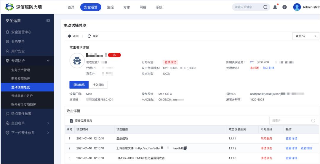 同时,深信服云蜜罐将获取的攻击者信息,同步至下一代防火墙,管理员通过防火墙管理界面即可知悉存在威胁的攻击者,一键阻断具备指纹信息的攻击者,即便攻击者变换 IP也无法发起入侵行为,构建“硬核”的主动防御网。