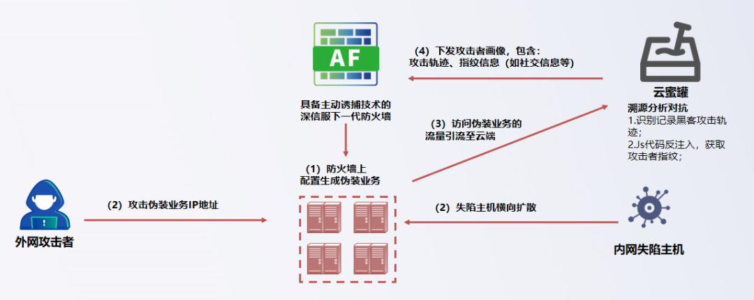 如果将防火墙的智能防护能力与蜜罐的诱捕溯源能力相结合,各系统充分联动、信息共享,便可以在有效信息情报的基础上对入侵者进行锁定与处置,展开全面、精准的溯源反制,缩短威胁处置时间,最终在实战攻防中占据先机。