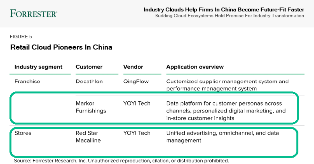报告中解读了阿里云、腾讯云、百度云、AWS 和 Microsoft Azure 等公有云生态系统,并列举了百度、华为、商汤等云服务供应商以及行业云Saas应用厂商的经典案例。同样,悠易凭旗下Martech产品(智能广告平台、客户数据平台、智能营销平台)基于行业云服务的一站式 SaaS 解决方案被选入该报告。