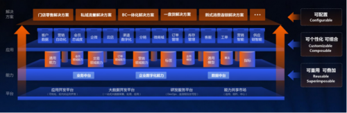 第一层支撑业务开展的开箱即用的数字化系统,即SaaS应用,能够支撑新的业务模式运转,能满足市面上大部分企业的诉求。