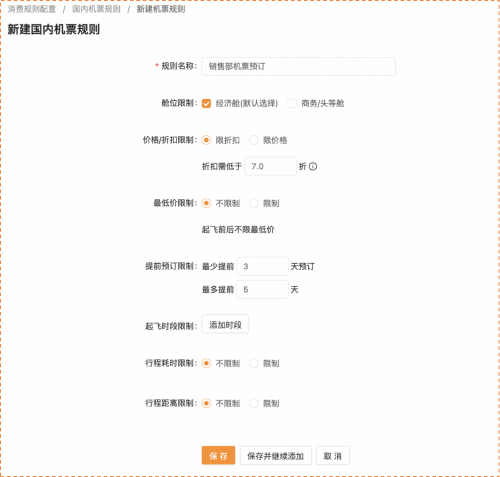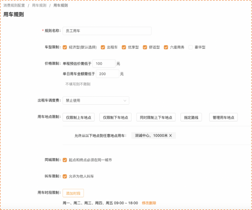 在消费规则配置方面,分贝通能够帮助企业制订兼具精细化和定制化的消费规则,从多个维度落到实处,以机票和用车场景为例。
