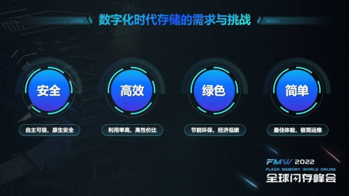 同时,在用户侧,对安全、高效、绿色、简单的要求成为数字化时代对于存储的需求核心。自主可信、原生安全,利用率高、高性价比,节能环保、经济低碳,最佳体验、极简运维等具体需求为存储发展提出新挑战。