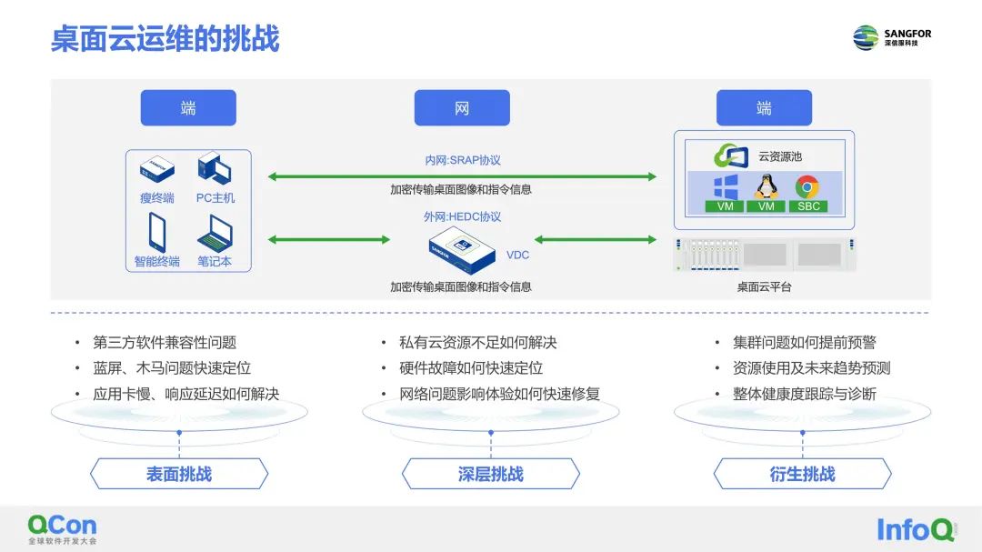 随着桌面云运维遇到第三方软件兼容性、蓝屏、木马等挑战,企业需要快速定位问题所在,如应用卡慢、响应延迟等,以及企业可能遇到私有云资源不足、硬件故障、网络等深层挑战,为此,深信服提出了桌面云智能运维一体化技术方案。