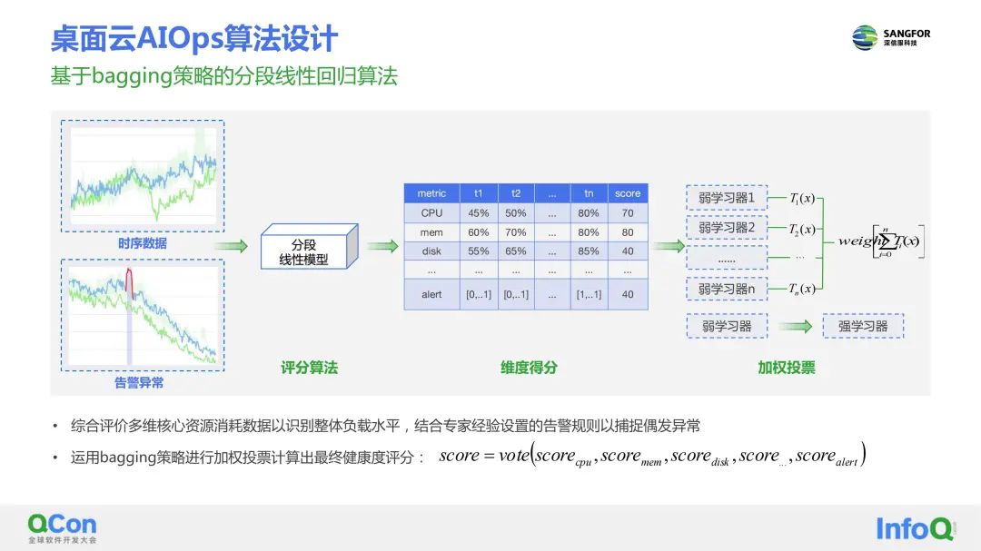 基于CPU、内存、磁盘、告警等多维度学习,为每个维度建立弱学习器,最后综合多个弱学习器构建强学习器,计算得出整体的健康评分。