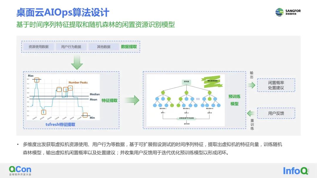 基于时间序列特征提取和随机森林的闲置资源识别模型,结合可扩展假设测试的时间序列特征,扩充虚拟机特征维度,训练随机森林模型,输出虚拟机闲置概率以及处置建议,同时收集用户反馈迭代优化预训练模型以形成闭环。