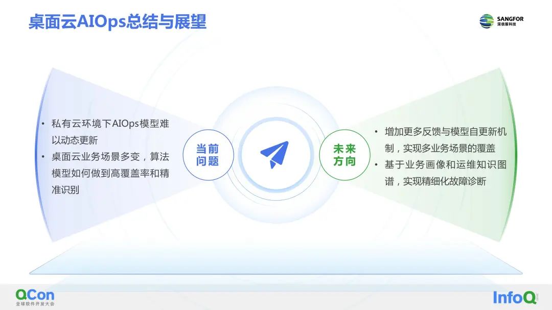 此外,深信服桌面云AIOps也面临一些挑战。比如私有云场景下,因网络限制,很难获取大规模数据持续不断地进行AI学习,这导致整个AI链路过长。其次,用户的业务场景很多,在医疗、金融等不同场景下,算法模型如何做到较高的覆盖率和精准的识别,这也是当前比较棘手的一个问题。