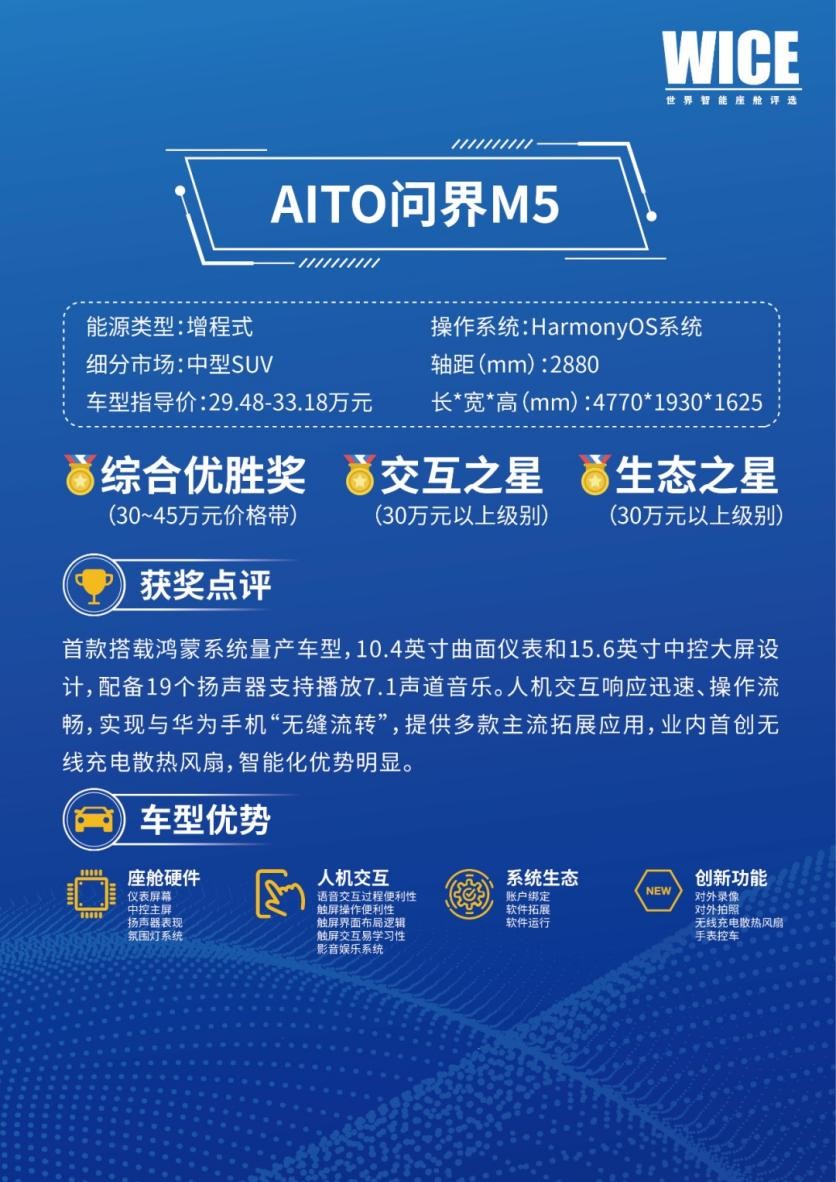 当下,智能网联汽车产业转型与发展成为大势所趋,是技术突破的新方向和新赛道,WICE世界智能座舱作为消费者关注汽车行业、智能驾驶最新发展趋势及全球前沿科技的权威途径,向世界展现了智能座舱的无限可能。问界M5在WICE世界智能座舱评选中大放异彩,展现多项新技术,推动智能网联汽车的创新升级,也成为引领智能网联汽车高质量发展的拓路者。