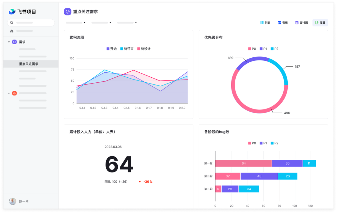 除了视图,飞书项目也通过原生集成的度量功能提供了丰富、灵活的图表,赋能项目对各项重要指标进行实时度量,并驱动项目持续完善,为管理层进行数据驱动的决策提供有力支撑。