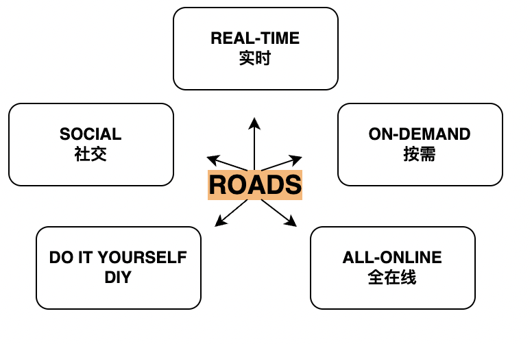信息时代的用户体验需求可归纳为五个特点:实时,按需定制,全在线,自助服务,以及社交分享,即:REAL TIME, ON DEMAND, ALL ONLINE, DIY, SOCIAL,将各首字母组合即为ROADS。