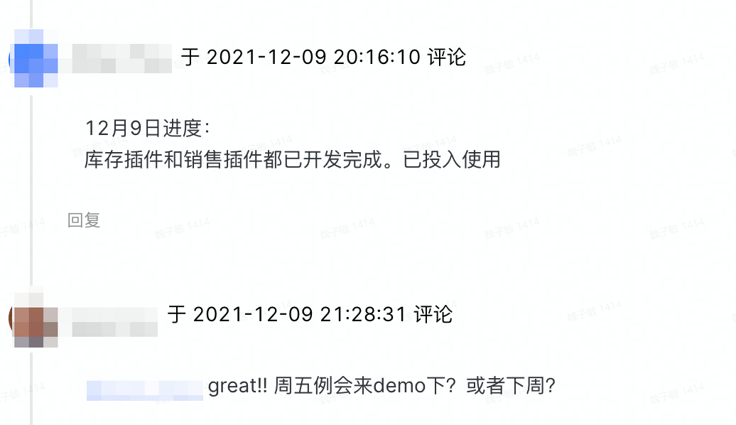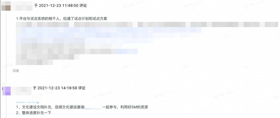 ·通过飞书项目中各个项目的实施人留评互动, 了解细节的同时,还能更好的关注到毎位同学的工作和成长。