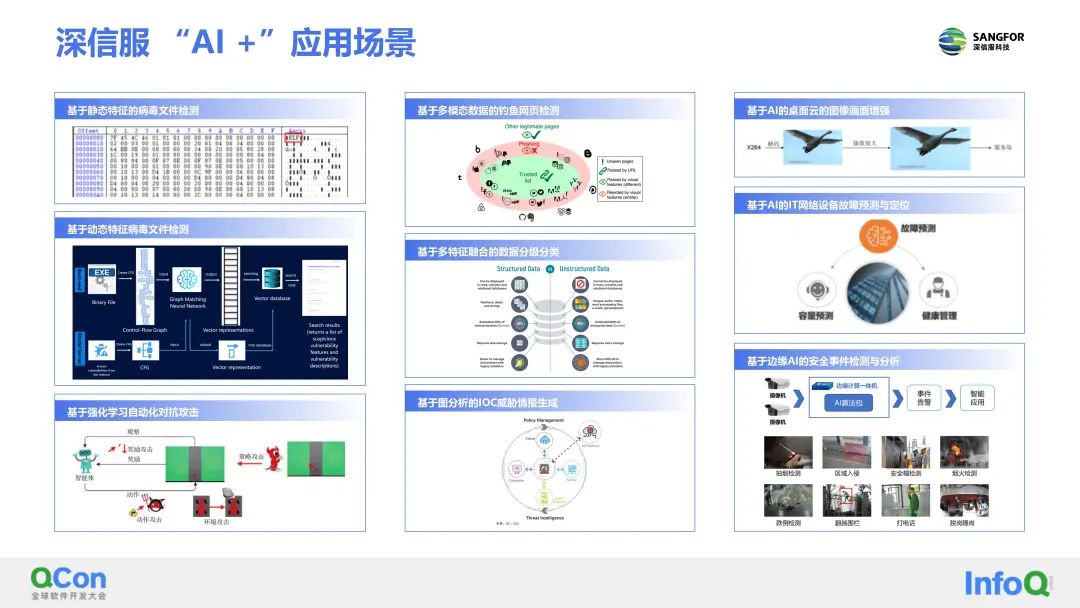 深信服的AI技术主要是应用在网络安全和云计算两大业务中。在网络安全方面,AI能力会应用在病毒文件检测和家族分类、Web对抗攻击、威胁情报、数据分级分类等产品中。在云计算方面,像桌面云视频画面的增强、托管云平台故障智能预测和性能诊断与优化、边缘云的安全生产视频监控分析等场景也会用到AI。