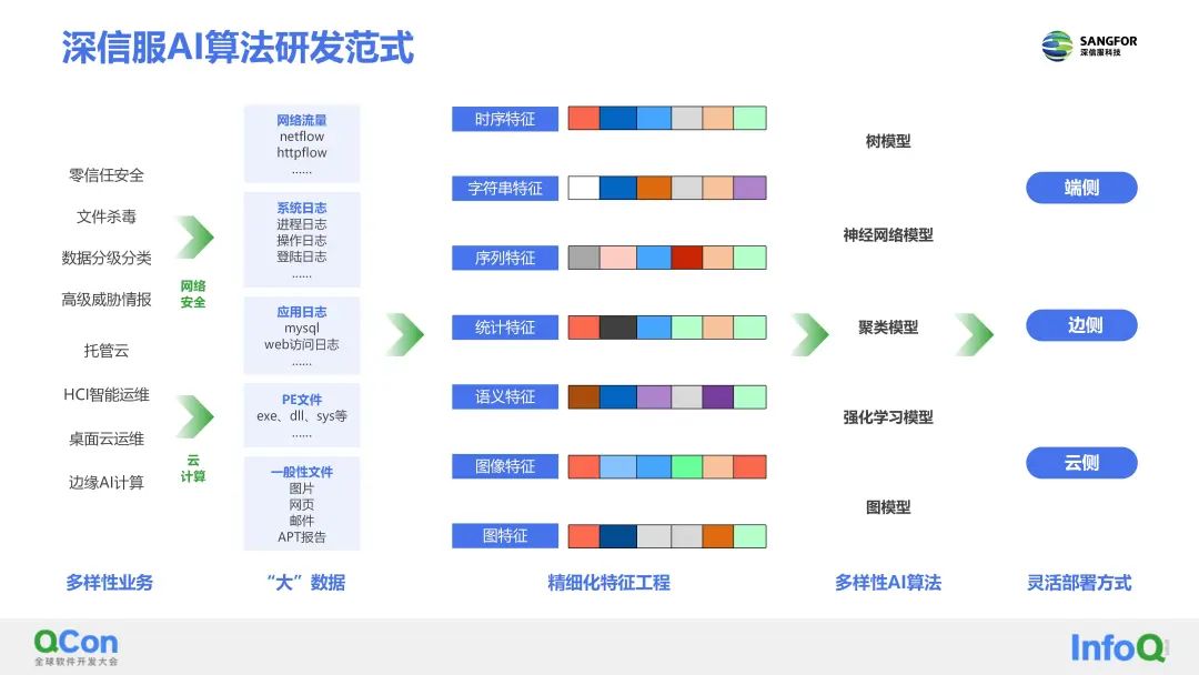 深信服AI算法研发的过程,可以抽象成这样一个典型研发范式,业务上从网络安全和云计算两个维度来看,都会涉及到对接海量业务数据,比如说网络流量、系统日志、各种恶意文件以及云平台的运维日志。中间要经过业务强相关的特征提取,或者基于自动编码器、Graph Embedding、Word2Vec等技术自动的特征提取。最后考虑基于云端、PC端或者边缘计算设备端,高效地将算法部署运行起来。