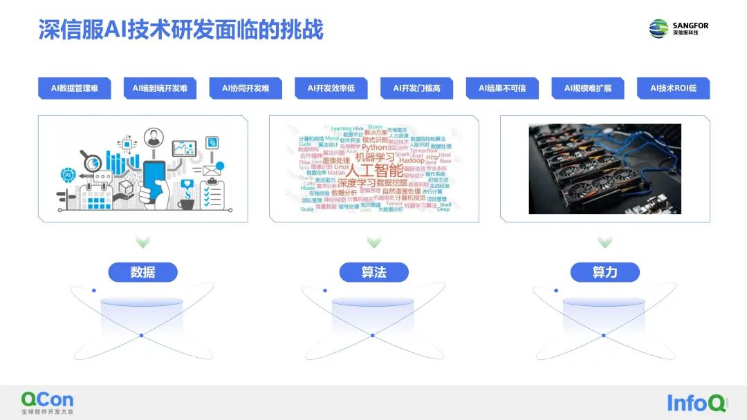 深信服AI技术研发,主要面临数据、算法、算力这三大核心挑战。