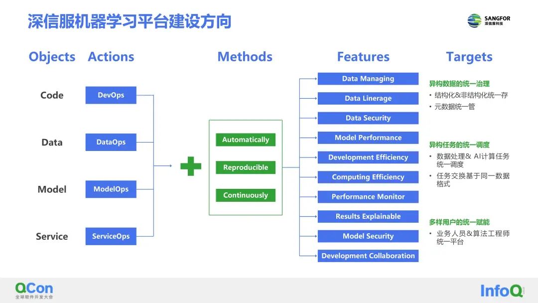 基于敏捷开发理念,通过DevOps、DataOps、ModelOps、ServiceOps四个行动,来实现算法开发流程可自动化、AI实验可重现以及AI模型可迭代。当前机器学习平台的重点是实现异构数据的统一治理、异构计算任务的统一调度、多样用户的统一赋能。
