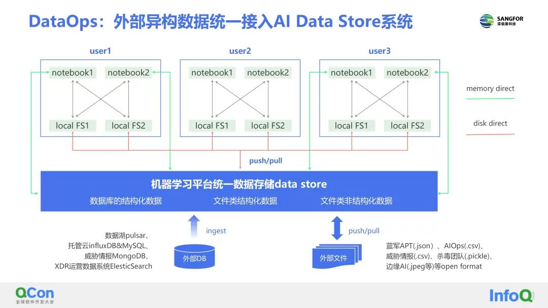 第一个挑战是AI数据层面。深信服AI研发面临首要问题是业务数据孤岛比较多,不同的细分的业务,会有自己独立的数据存储系统。算法工程师想获取这些研发的数据,面临的阻碍会比较大,获取研发数据的时间长。其次,算法工程师取到的这些数据,因为要做精细化的特征工程,但是现在企业内部缺少比较高效地能够去管理这些中间特征以及一些高价值数据的支撑工具,导致它的数据很难被算法工程师二次使用以及被相关性比较高的任务复用起来。