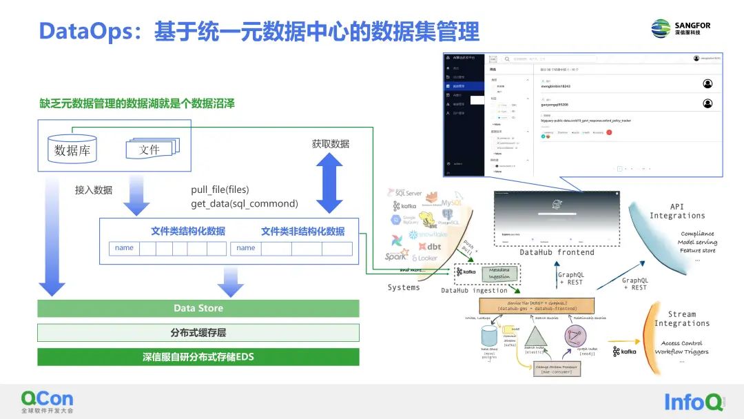 针对外部异构的数据,深信服提出了AI Data Store,一种继承湖仓一体设计理念的多样性AI研发数据统一存储和消费的数据系统,实现了外部数据的统一接入和存储管理。比如数据库类的结构化数据、文件类的结构数据以及文件类的非结构化数据这三类数据,可以统一存储管理。