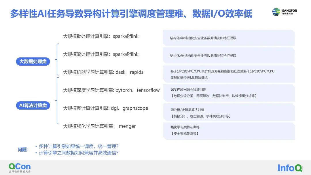 针对多样性AI任务导致异构计算引擎调度管理难的问题,深信服AI研发团队把AI计算引擎分为两大类,一类是大数据分析型的,主要用于数据清洗、特征提取,比如Spark,Flink;另一类是AI算法计算型的,主要用于ML&DL算法训练,甚至包括图分析、计算框架dgl、graphscope、以及强化学习menger等。