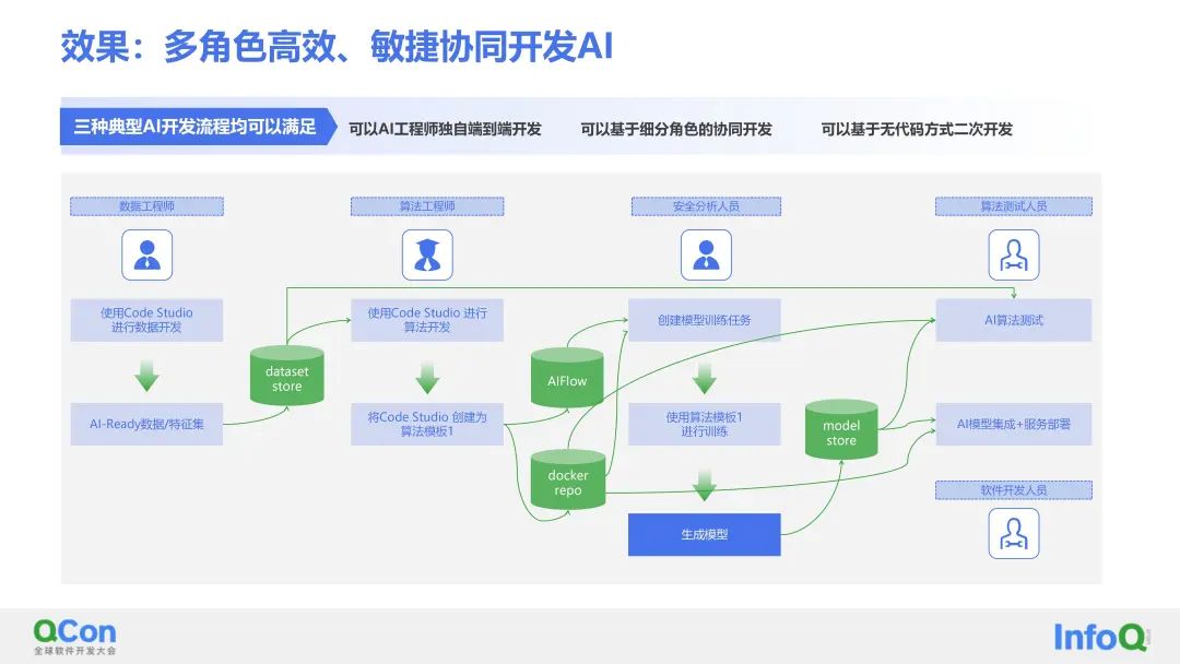借助于低代码开发算法平台,可以使得各个角色之间高效协作。针对端到端的AI研发人员来讲,如果是任务比较小,算法工程师可以独自完成这些工作。但当AI的任务业务变得比较大的时候,数据特征的提取、模型的调参、算法的测试,包括集成到产品线、产品当中去,就可以利用该平台,实现多角色任务协作。