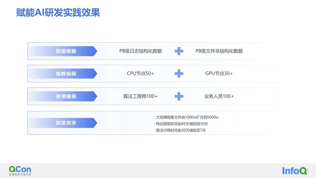 在数据规模层面,已经实现支持TB级的异构数据的统一管理。在集群规模上,支持10+CPU节点。在研发效率上,大规模病毒文件特征提取时间由45天缩短到15天。