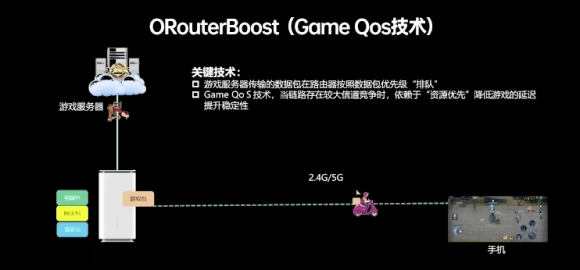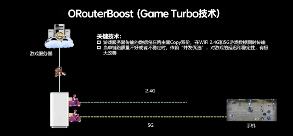 据了解,其中的两大关键技术之一为Game Turbo技术。这项技术可使游戏服务器传输的数据包在路由器CPE端会拷贝双份,这样游戏数据就能在WiFi 2.4G和5G频段同时传输。对用户而言,当单链路质量不好或稳定性不好时会依赖并发优选,这样就能确保始终有一条链路数据包传输到手机上,极大改善了游戏时的低延迟和稳定性。