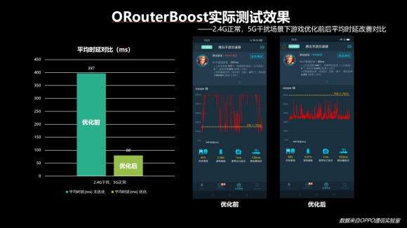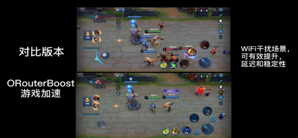 如今,LinkBoost3.0再度升级手机终端网络体验。其中的ORouterBoost技术作为面向游戏的技术优化课题,基于双WiFi,结合OPPO在自家CPE进行私有协议定制开发,通过两大关键技术,有效解决了游戏场景高延迟和不稳定的痛点。特别是在家庭聚会多人开黑或是边看电视边玩游戏的应用场景下,这项技术的效用更为显著。