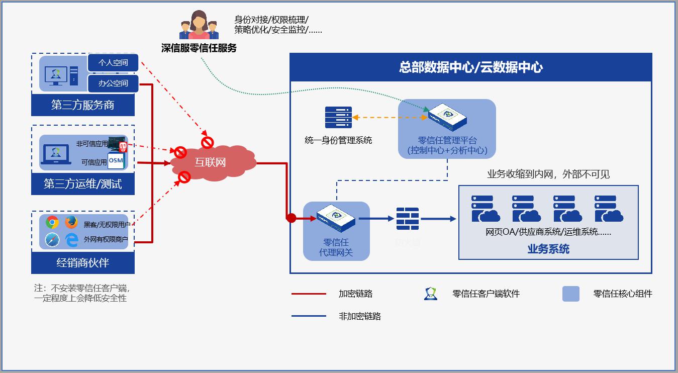 零信任的部署,能够在身份、终端、业务、数据、网络等方面为用户第三方接入提供安全保障。