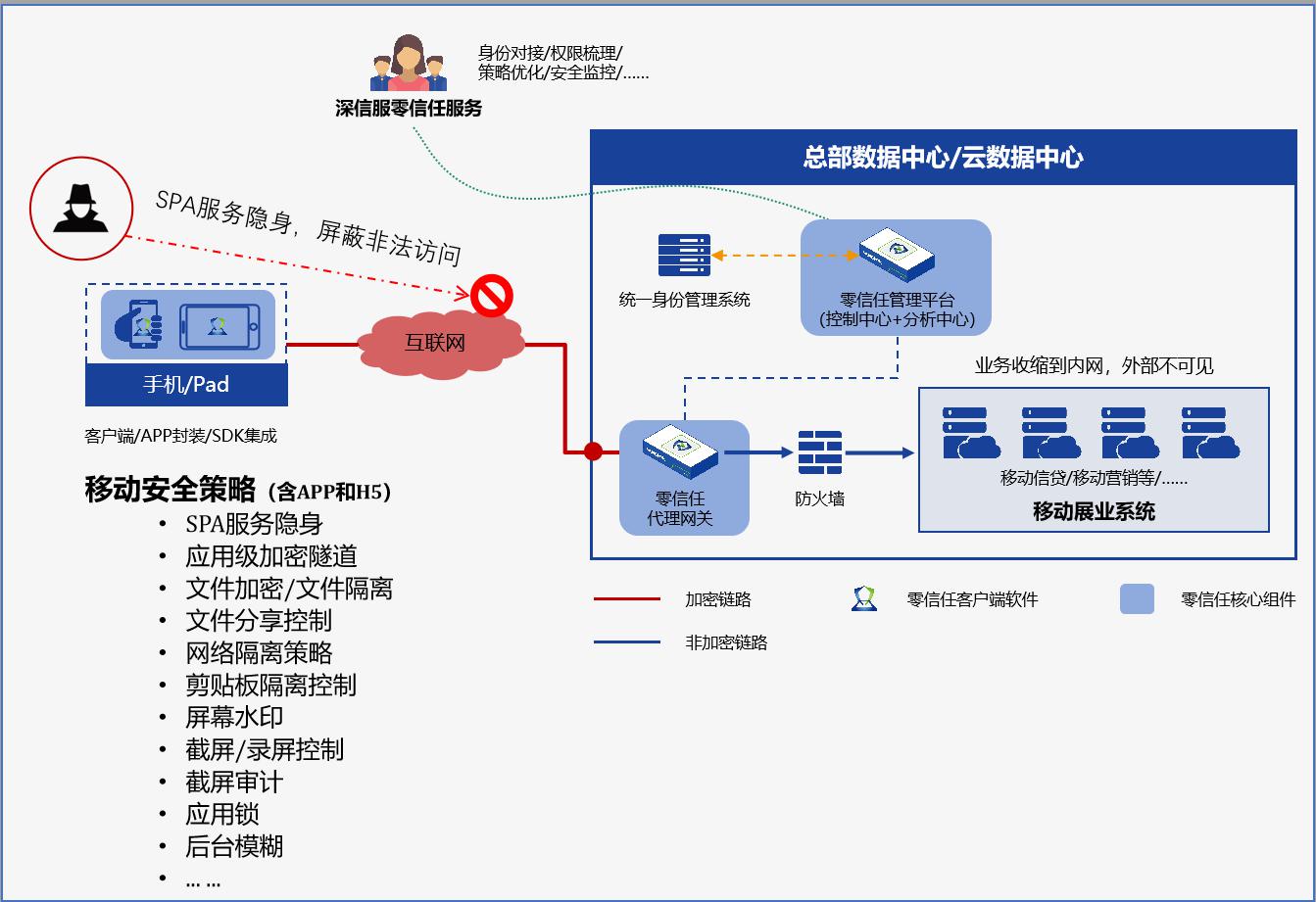 SDK集成/应用自动封装:移动APP可集成零信任SDK,实现终端环境基线检查,业务数据本地加密存储、内存拷贝阻断、屏幕水印震慑截屏拍屏行为等能力,以及L3+L4隧道加密,保证数据传输的机密性与安全接入,也可以采用自动封装方式,0开发实现安全改造;