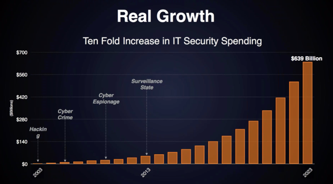 王富贵:所以在2004年到2005年间,网络犯罪成为了当时最大的问题。为了打击网络犯罪,我们也做出了很多的努力。此后的几年,随着关于网络间谍APT 1 活动报告的公布,国家也被卷入到这场博弈之中。而且之前,美国FBI还发布关于APT 6活动的警告通知,很显然自从2008年以来该机构已经深入美国联邦政府内部。当然2013年以后,人们也开始担心国家的监控,国家的情报部门会花费大量的预算入侵我们,所以说有时候政府也是网络入侵的参与者。因此,应对如今的局面需要大规模的预算支出,我预计到2023年支出将会增长到6400亿美元,这意味着24%的复合平均增长率。