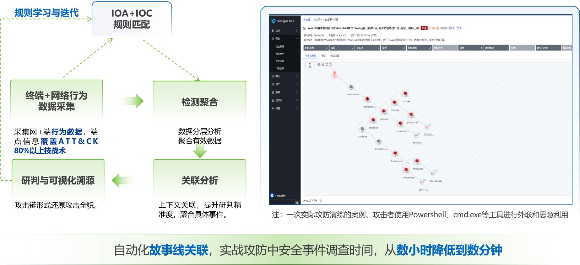用户可根据业务实际情况,将事件匹配到业务场景,进行安全事件的深度挖掘与狩猎,及时发现潜伏威胁。经过验证,XDR可实现自动化故事线关联,使实战攻防中安全事件的调查时间从小时级降低到分钟级。