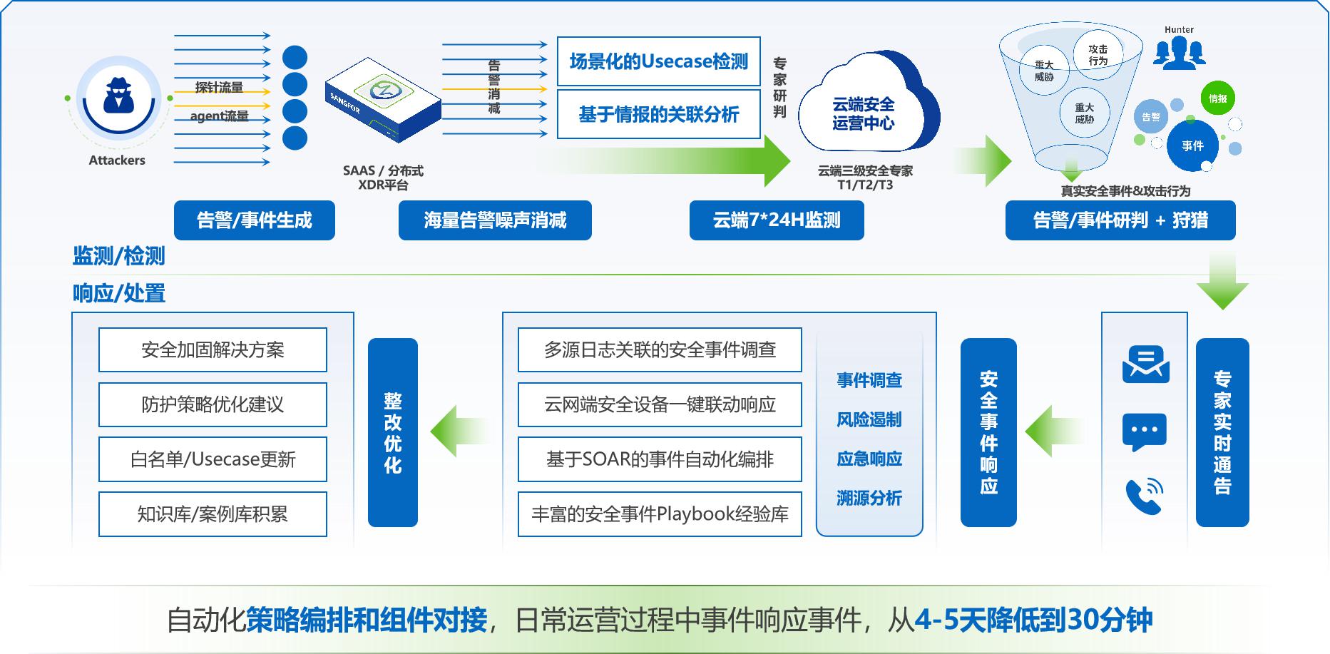 此外,深信服XDR原生融合和原厂的设备,实现了策略规则的打通,基于SOAR等组件,可以将事件的精准响应,从4-5天降低到30分钟以内。