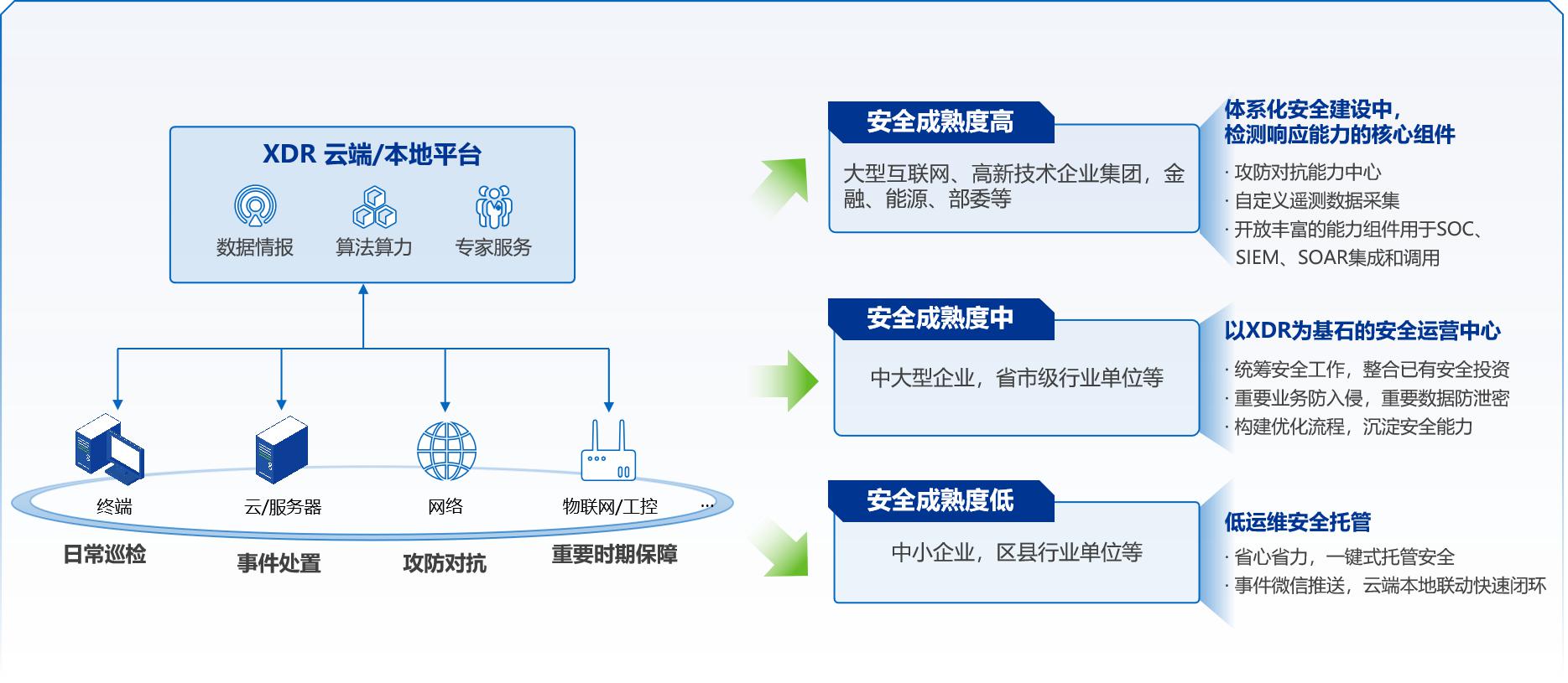 对于追求极致安全攻防效果、安全成熟度高的用户,XDR可以利用创新架构带来的检测响应能力补充用户现有的安全体系,通过开放接口整合用户已有的SOC/SIEM平台,让用户更加从容地抵御网络攻击。