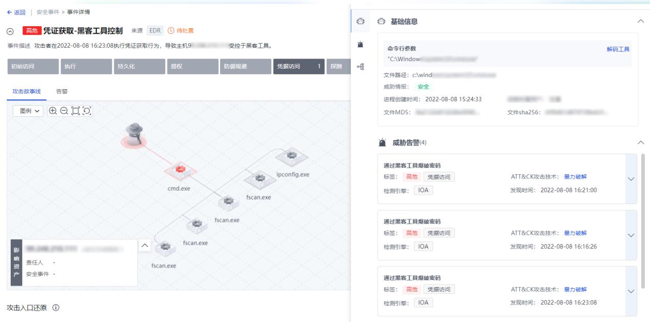 8月8日,深圳某头部银行科技子公司测试Cobalt Strike后门上线,并运行黑客工具fscan对内网扫描,以此检验现场各厂商检测精准度。深信服XDR检测出CS上线异常情况,并且通过可视化进程链准确定位终端进程,真正实现网端联动光速定位。