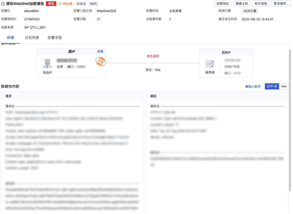 8月2日,深信服XDR精准检测到红队对某大型国有建工集团的视频会议系统进行加密WebShell上传、访问加密WebShell等一系列攻击。MDR安全服务专家快速隔离失陷主机,避免进一步横向扩散。仅用6分钟,深信服完成从事件检出到服务器隔离处置全流程,获得用户称赞。