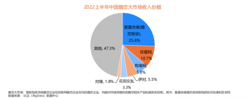 值得注意的是,中国婚恋大市场行业继续向头部企业集中,其中包含“百合网”和“世纪佳缘”两大头部婚恋平台的复爱合缘婚恋板块,凭借其品牌影响力和成熟的线上线下业务模式稳固行业领先地位,收入份额占比达25.6%,稳居行业首位;其次为珍爱网和有缘网,分别为10.7%和5.8%。