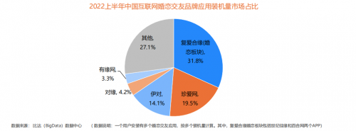同时,在品牌应用装机量市场占比中,复爱合缘婚恋板块以31.8%的份额位列首位;珍爱网排行第二,为19.5%;而伊对以14.1%的份额排名第三。
