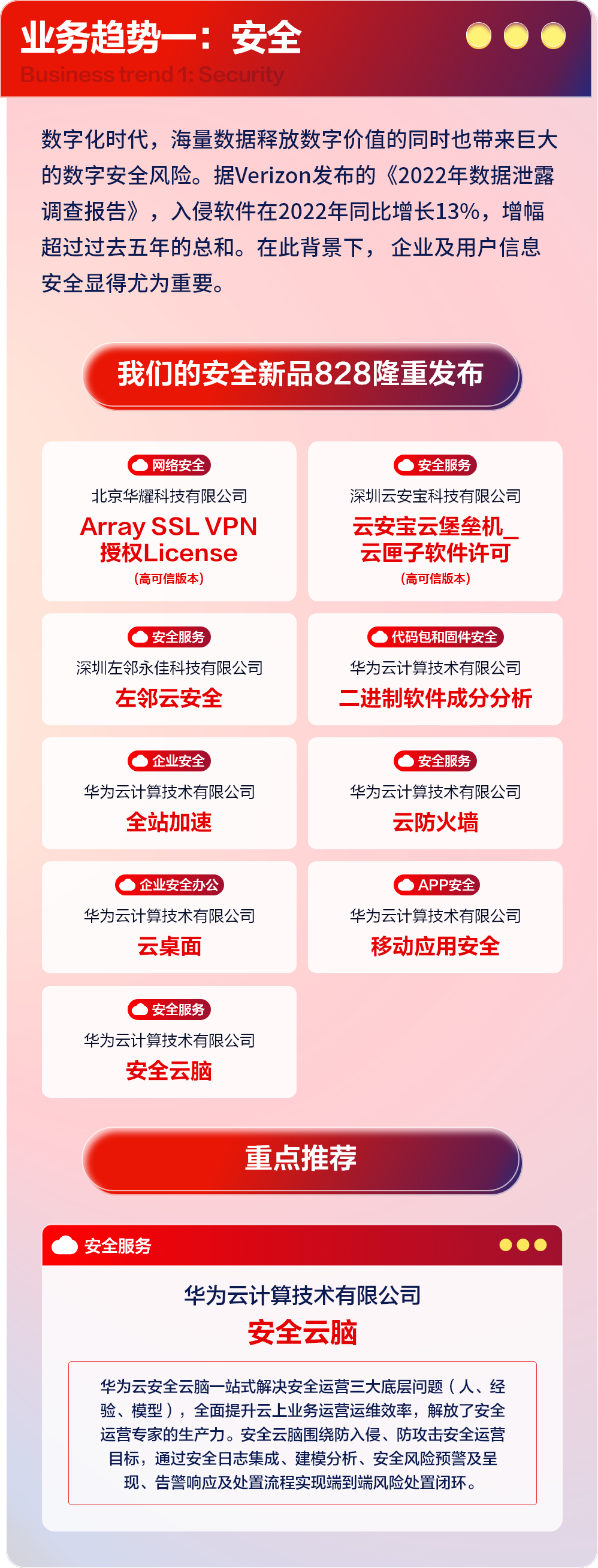 在此背景下,828 B2B企业节多家服务商从企业及用户信息安全重点场景出发推出新品。如华为云推出安全云脑一站式解决安全运营三大底层问题(人、经验、模型),全面提升云上业务运营运维效率,解放了安全运营专家的生产力。华为云安全云脑围绕防入侵、防攻击安全运营目标,通过安全日志集成、建模分析、安全风险预警及呈现、告警响应及处置流程实现端到端风险处置闭环,全面提升云上业务运营运维效率,解放安全运营专家的生产力。