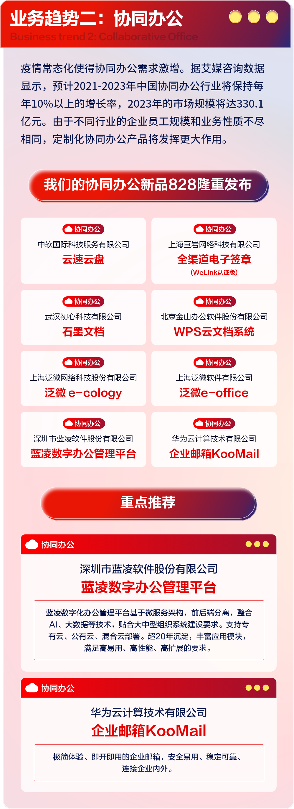 本次828 B2B企业节,为满足中小企业客户企业在云端部署、交互体验等维度的不同需求,诸多协同办公领域企业纷纷推陈出新,打造定制化体验。深圳市蓝凌软件股份有限公司推出的蓝凌数字办公管理平台,基于微服务架构,前后端分离,整合AI、大数据等技术,设置丰富应用模块,贴合大中型组织系统建设要求,支持专有云、公有云、混合云部署;上海泛微网络科技股份有限公司推出的泛微 e-cology,采用智能语音交互以及全流程无纸数字化,全行业生态链适配,打造一体化的信创协同平台解决方案。