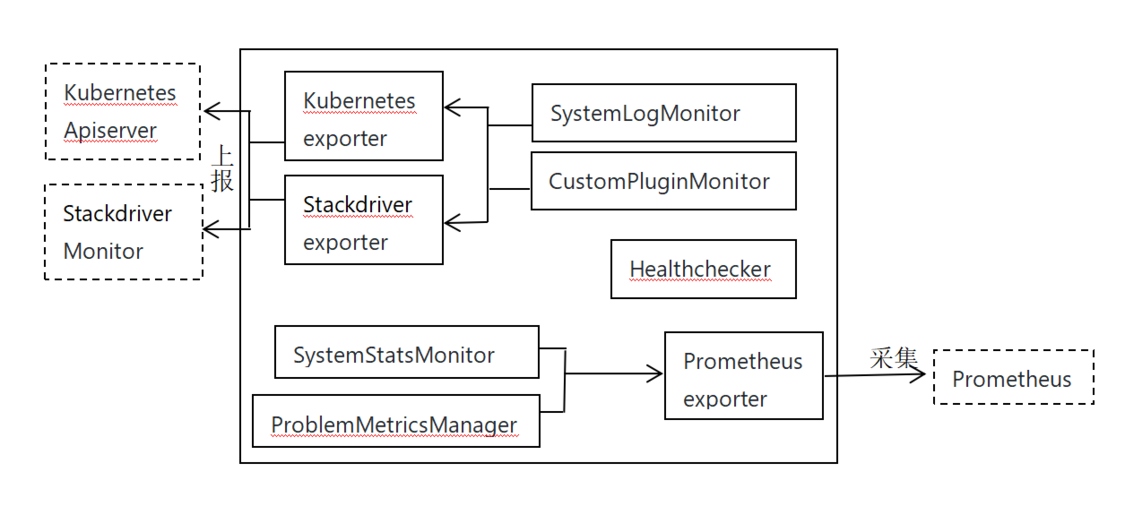 node-problem-detector主要包括“Monitor”和“Exporter”两大类型功能组件。“Monitor”类组件负责异常问题检测或指标数据采集,“Exporter”类组件负责向上对接控制层面进行数据上报。其中SystemLogMonitor和CustomPluginMonitor检测到的异常或指标可通过Kubernetes exporter或Stackdriver exporter分别上报到kubernetes apiserver 或Stackdriver Monitor。而SystemStatsMonitor和ProblemMetricsManager的监控指标数据通过Prometheus exporter暴露,进而可以通过Prometheus采集到相关数据。